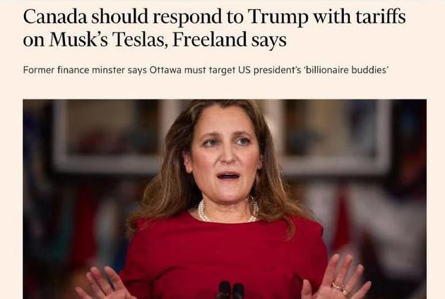 加拿大前财政部长克里斯蒂亚·弗里兰(Chrystia Freeland)最近表示:“面对美国总统特朗普的经济攻击,必须对包括特斯拉在内的特定美国产品征收高额关税。”